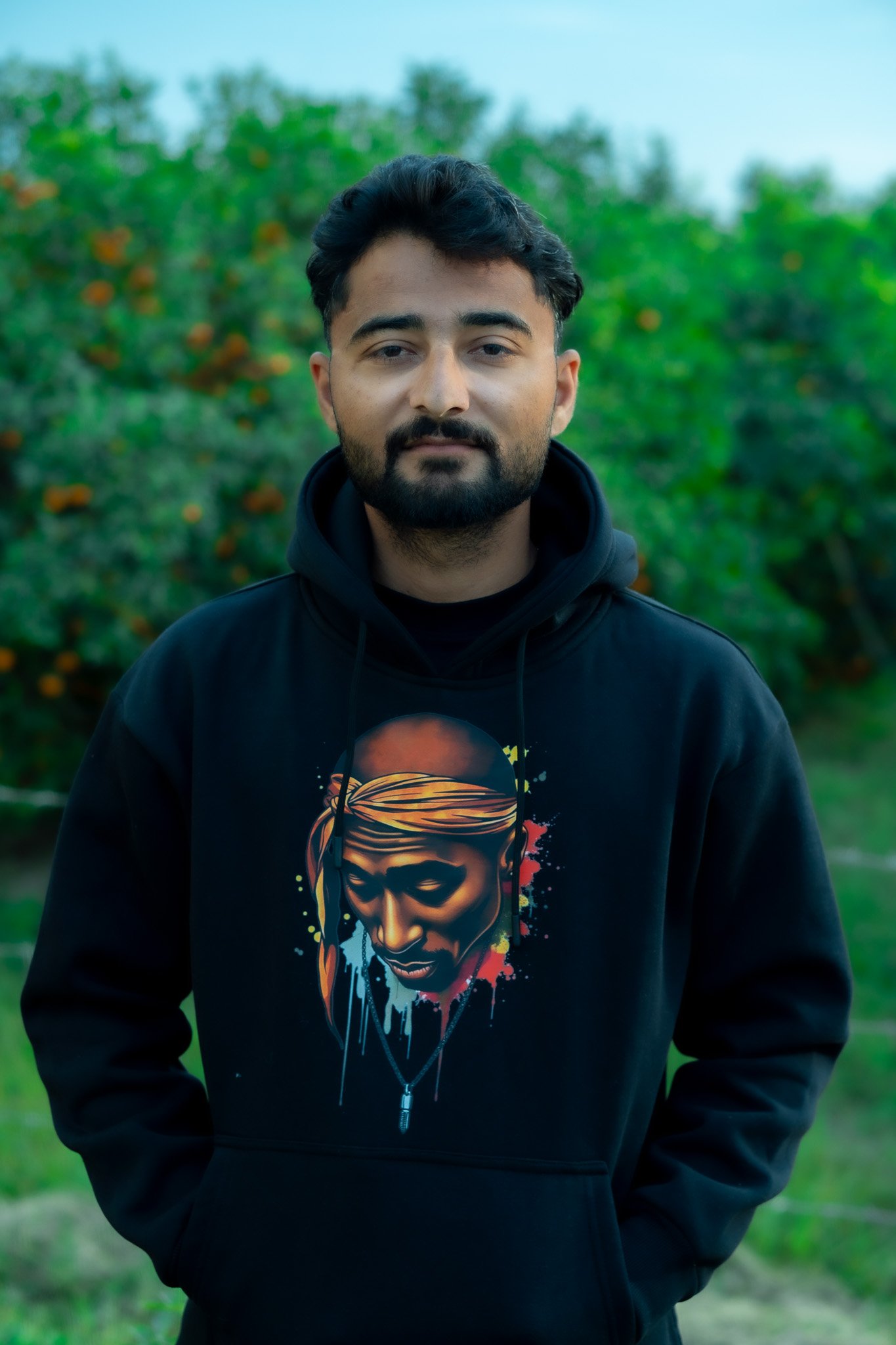 The front features a stunning artistic portrait print, designed to stand out with vibrant colours and a modern streetwear vibe.