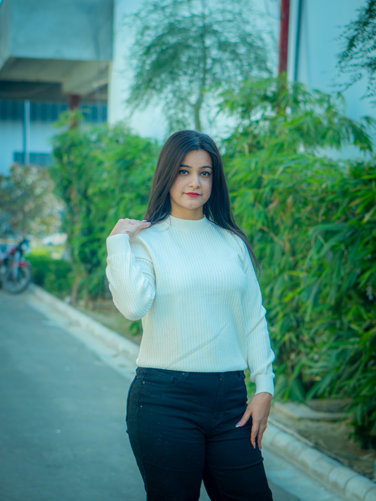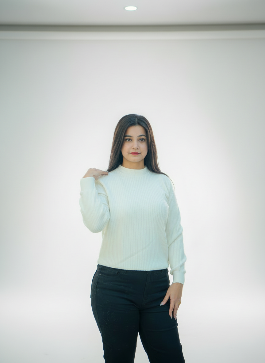 The creamy white color gives a gentle, feminine glow while remaining versatile enough to pair with jeans, trousers, or skirts. The ribbed texture adds subtle style, making it ideal for office wear, casual outings, or layering during colder months.