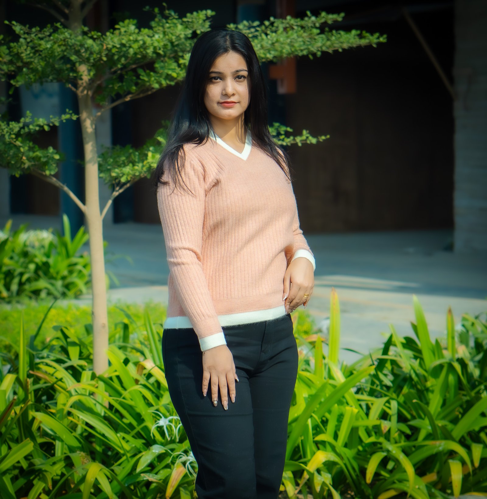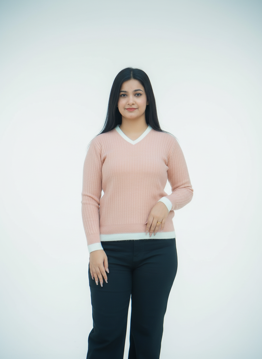 The sweater features a beautiful pastel pink colour, giving it a fresh, feminine, and cozy winter look. The white contrast detailing on the neckline, hem, and cuffs enhances the overall style, making it look clean and premium.